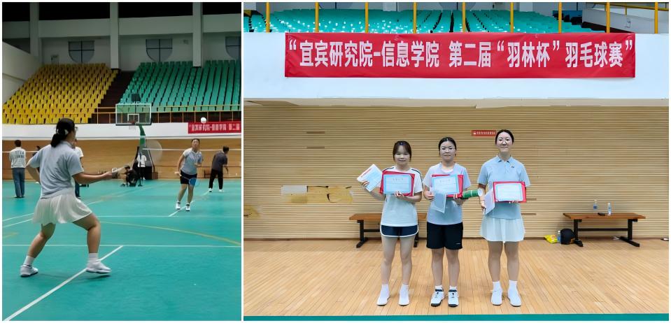 随后进行的女子组比赛同样精彩纷呈。4名选手在球场上灵活穿梭,以精准的吊球和有力的扣杀诠释了羽毛球运动的“刚柔并济”。宜宾研究院的选手们在11分制淘汰赛与21分制决赛中发挥稳定,沉着应战。最终,信息学院胡雪艳夺得冠军,廖伟思、闵佳琪分获亚军与季军。其中,我院选手闵佳琪在季军争夺战中稳扎稳打,以2:0的比分取得胜利,为宜宾研究院赢得了荣誉。