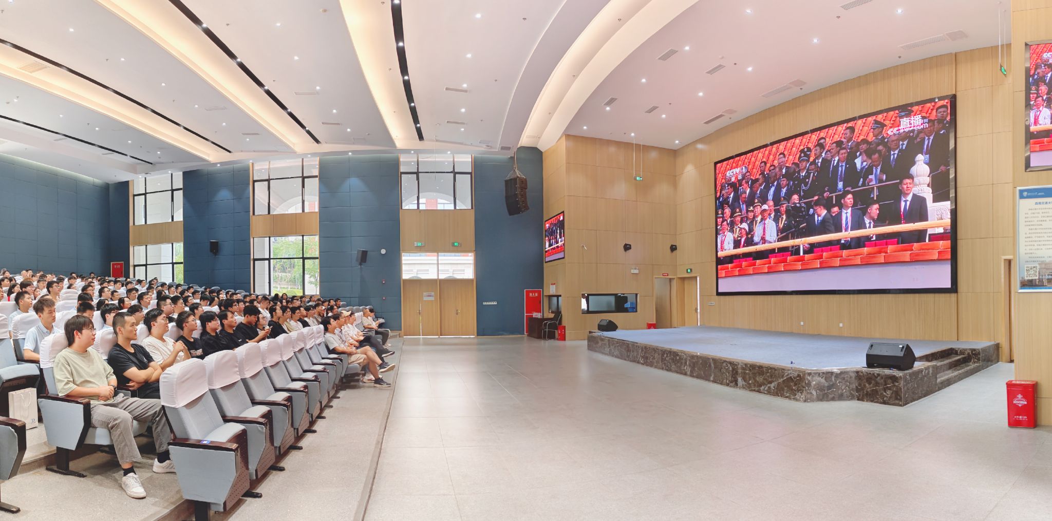 2025年9月3日,宜宾西南交通大学研究院组织全院师生在学术报告厅集体观看纪念中国人民抗日战争暨世界反法西斯战争胜利80周年大会现场直播,共同缅怀先烈,铭记历史,致敬和传承伟大抗战精神。报告厅现场气氛庄重而热烈,当国旗升起、国歌奏响时,全体师生自发起立,齐声高唱国歌。